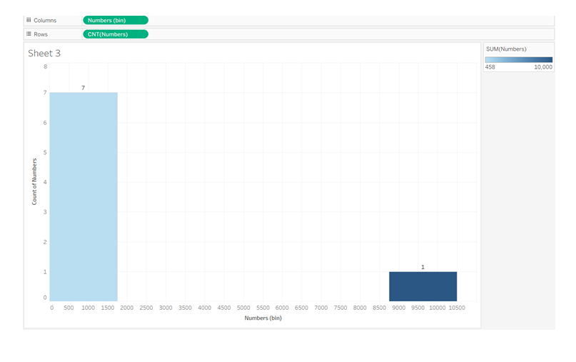 If we look at our first set of eight integers, we can see that the outlier 10000 is far to the isolated right bar, while the remaining seven data points are all to the left bar.