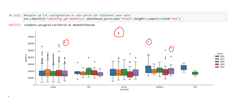 In the graph below, there is an outlier in the “corner LotConfig” with a Saleprice of more than 700000 for the year 2007.