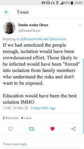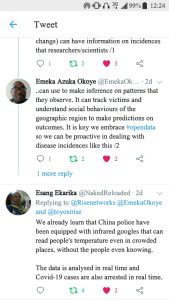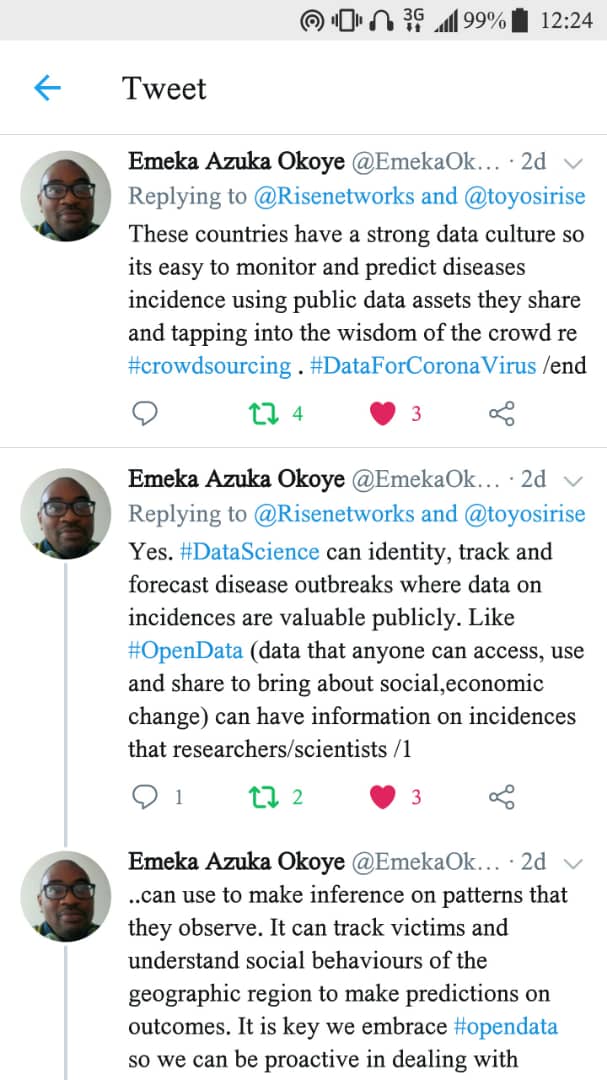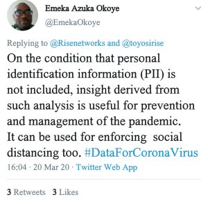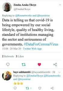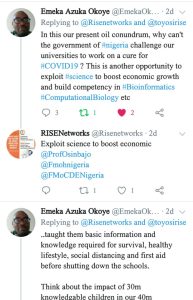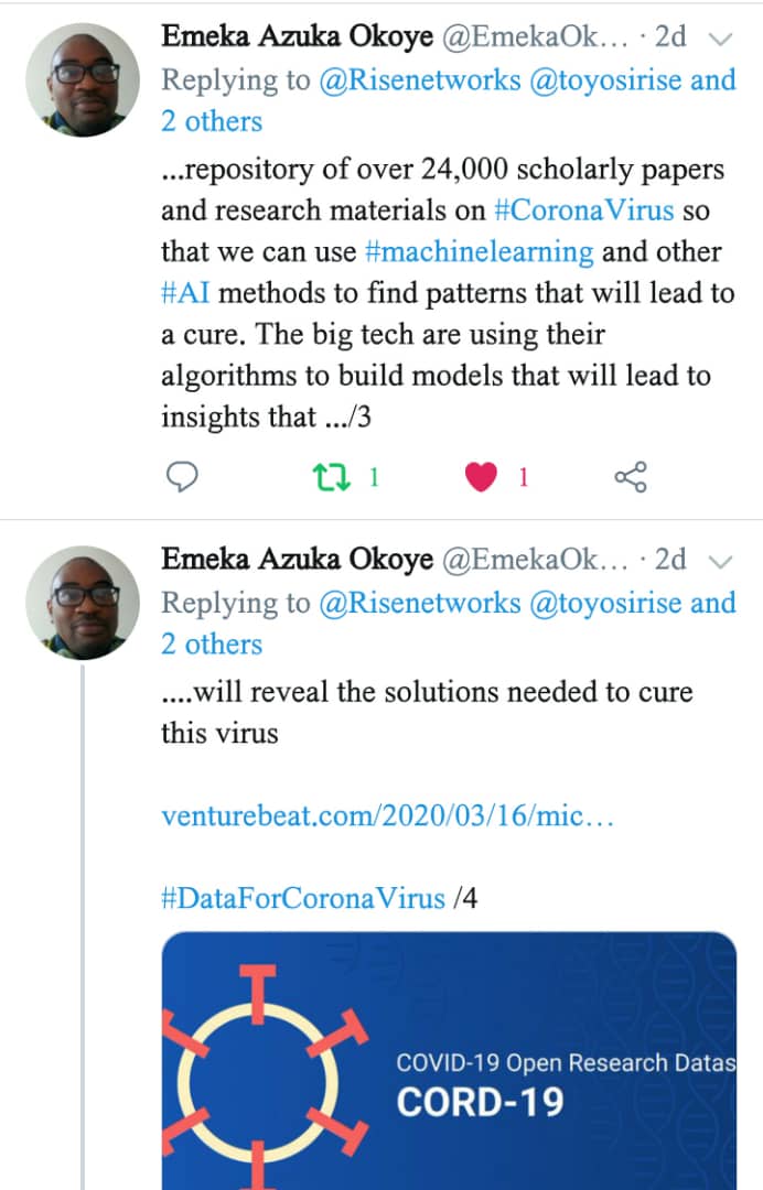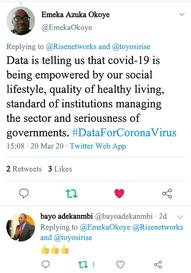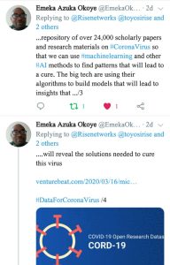 As part of our ongoing series on using Research, Data and Information Management to contain and curb the coronavirus pandemic in Nigeria, Rise Networks hosted a Live Twitter chat with Emeka Azuka Okoye, a Knowledge Scientist in Open Data and Semantic Artificial Intelligence and a Member of the Rise Networks Advisory Board at 3pm on Friday 20th March 2020.
