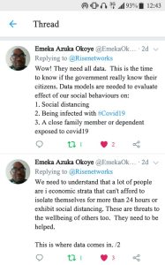 Wow! They need all data. This is the time to know if the government really know their citizens. Data models are needed to evaluate effect of our social behaviours on social distancing, being infected with the virus and a close family member or dependent exposed to covid19. We need to understand that a lot of people are in economic strata that can’t afford to isolate themselves for more than 24 hours or exhibit social distancing. These are threats to the well being of others too. They need to be helped. This is where data comes in.Having a medical database of all Nigerian citizens is a precondition for implementing any stimulus package. Anything outside that would be tantamount to BAT distributing wads of Naira notes from his bullion van to thugs. Problem is, some would go home with more cash than others.